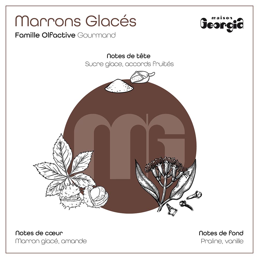 Offrez-vous un instant de pure gourmandise avec notre fragrance Marrons Glacés, une douceur sucrée inoubliable pour une ode à la magie des fêtes de fin d’année. Les notes de tête vous transporteront avec la douceur poudrée du sucre glace qui s’accorde subtilement à de légers accords fruités. Ensuite, le cœur de la fragrance révèlera sa véritable profondeur où les notes de marron glacé et d’amande s’entremêleront pour créer une sensation à la fois tendre et réconfortante.
